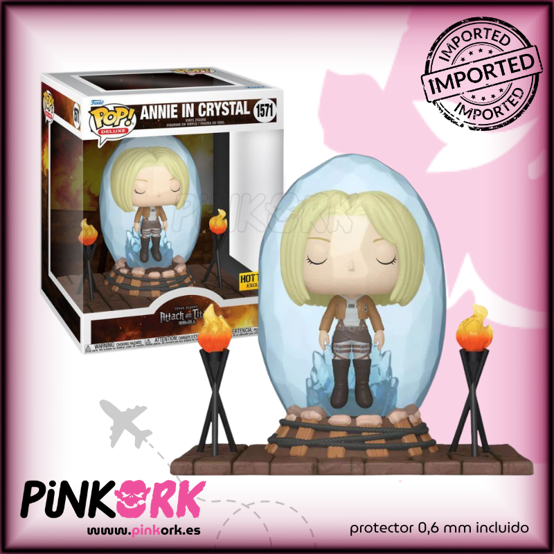 La figura muestra a Annie en posición fetal dentro de una gran estructura translúcida, simulando el cristal endurecido que la mantiene atrapada. Los detalles del cuerpo, el pelo rubio y la forma orgánica del cristal están cuidados al máximo, haciendo que el Pop! parezca una pequeña escultura sacada directamente de la serie. Al tratarse de una exclusiva de Hot Topic en versión de importación, se convierte en una pieza especialmente interesante para coleccionistas que buscan algo diferente dentro de la línea de Attack on Titan.
