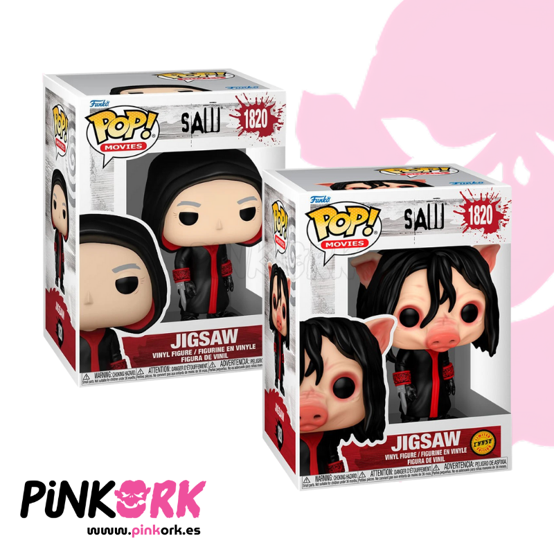 Este bundle exclusivo de 2 figuras Funko Pop! de Saw incluye la versión estándar de Jigsaw 1820 y su edición limitada Chase, en la que aparece con la inquietante máscara de cerdo utilizada durante sus rituales de secuestro. La figura regular muestra a Jigsaw en su atuendo clásico, mientras que la variante Chase añade un nivel extra de tensión visual y valor coleccionista. Ya disponible en www.pinkork.es, con unidades limitadas.