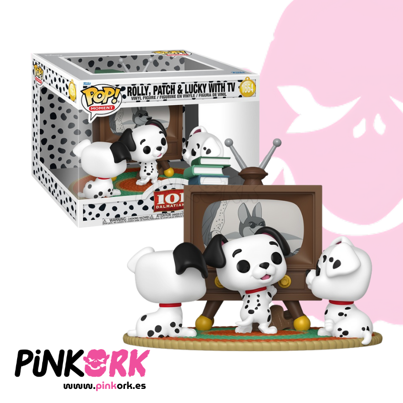 El Funko Pop! N.º 1664 de Rolly, Patch & Lucky with TV reúne a tres de los adorables cachorros protagonistas de 101 Dálmatas en una encantadora escena llena de nostalgia y ternura. 🐾📺
