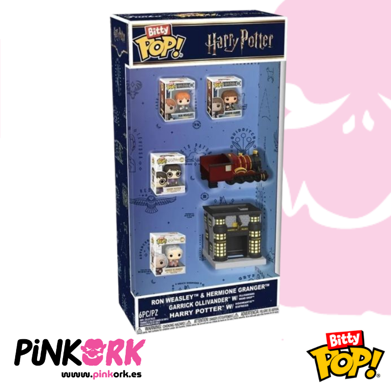 El set incluye a Harry Potter, Ron Weasley, Hermione Granger y Garrick Ollivander, junto a dos piezas especiales que representan el Hogwarts Express y la tienda de Ollivanders, creando un conjunto compacto y lleno de detalles. El formato Bitty Pop! mantiene el estilo inconfundible de Funko en un tamaño reducido, ideal para coleccionistas que buscan algo diferente y original. En www.pinkork.es puedes encontrar este set y muchas más figuras del universo Funko Pop!.
