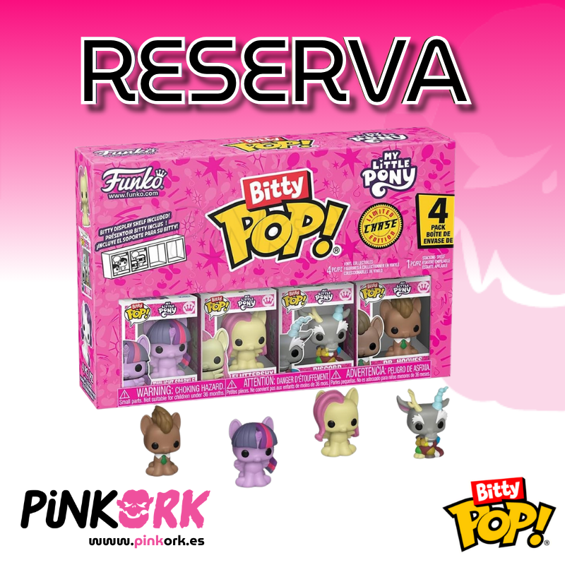 Este set reúne a cuatro de los personajes más queridos de la serie animada: Twilight Sparkle, Fluttershy, Discord y Dr. Hooves, todos reinterpretados en el adorable estilo Bitty Pop! de Funko.
