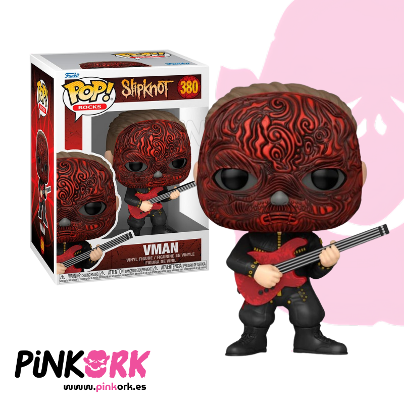 El Funko Pop! N.º 380 de Vman representa al miembro de la banda con su característico traje oscuro y la icónica máscara que lo distingue sobre el escenario. Con un bajo en las manos y una postura firme, esta figura transmite la intensidad y el estilo inconfundible de los conciertos de Slipknot.