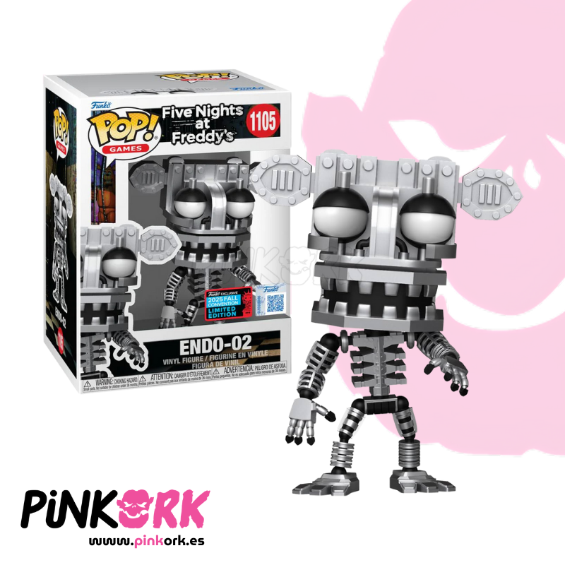 El Funko Pop! N.º 1105 de Freddy Endo-02 llega como una exclusiva NYCC 2025 (New York Comic Con), representando una de las versiones más inquietantes del animatrónico más famoso de Five Nights at Freddy’s. Esta figura muestra el esqueleto mecánico de Freddy sin su cubierta exterior, con detalles metálicos, ojos brillantes y una postura que transmite el terror característico del videojuego.