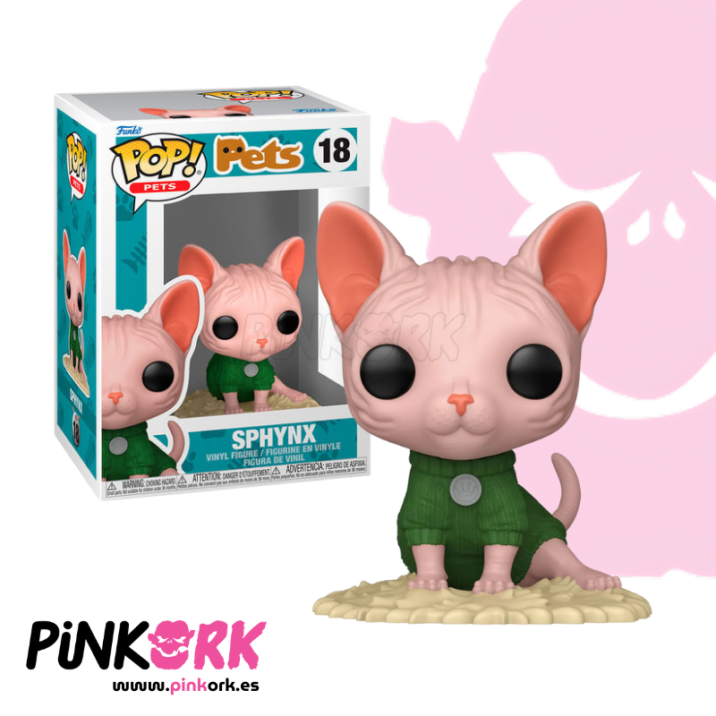 La figura Funko Pop! N.º 18 de la línea Pets representa a un elegante Sphynx, la raza felina sin pelo conocida por su apariencia única, ojos grandes y personalidad juguetona. Esta edición captura su esencia con un diseño que destaca sus orejas prominentes, la piel lisa y alas de energía sutil que transmiten su carácter curioso y encantador.
