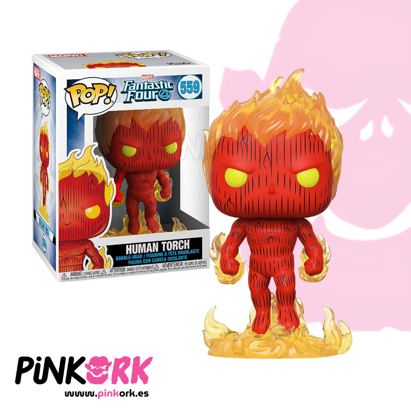 El Funko Pop! N° 559 de Human Torch, miembro fundador de los Fantastic Four, muestra a Johnny Storm envuelto en llamas, con su traje clásico azul parcialmente incendiado y expresión desafiante. Su figura estilizada y dinámica transmite todo el poder ígneo del superhéroe más explosivo del equipo. Disponible en stock en www.pinkork.es, con envío inmediato.