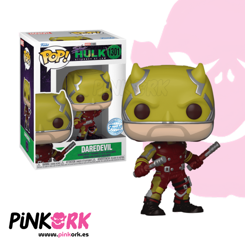 El Funko Pop! N° 1301 de Daredevil, en su versión aparecida en la serie She-Hulk: Attorney at Law, presenta a Matt Murdock con su nuevo traje amarillo y rojo, en una pose acrobática que refleja su estilo ágil y vigilante. Esta edición Special Edition es un homenaje a su reintroducción en el UCM con un diseño que mezcla nostalgia y renovación. Disponible en stock en www.pinkork.es, con envío inmediato.