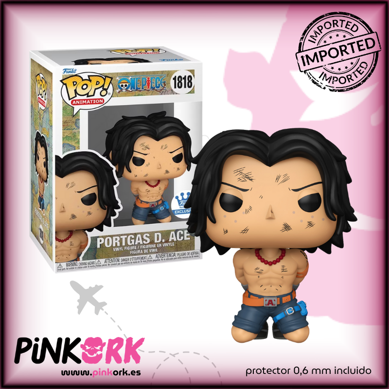 El Funko Pop! N° 1818 de Portgas D. Ace, edición Funko Exclusive, nos muestra al legendario comandante de la Segunda División de los Piratas de Barbablanca con su torso al descubierto, marcado por cicatrices de batalla, su clásico sombrero colgando a la espalda y la icónica expresión desafiante que lo caracteriza. Esta figura está disponible en stock en www.pinkork.es como artículo de importación, e incluye protector de 0,6 mm.