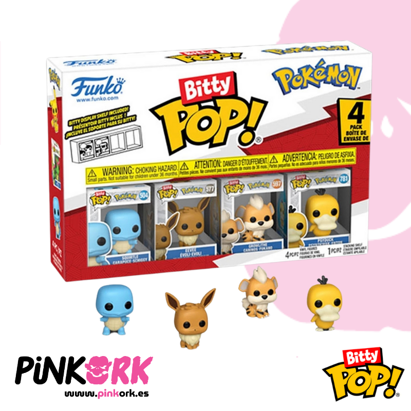 ¡La ternura de Squirtle en versión mini! Este 4 Pack de Bitty Pop! reúne a uno de los Pokémon iniciales más queridos de todos los tiempos, junto a otras figuras de la colección Pokémon, en un formato ultra coleccionable. Cada figura mide tan solo 2,3 cm, pero mantiene todos los detalles que hacen de Funko un fenómeno global.