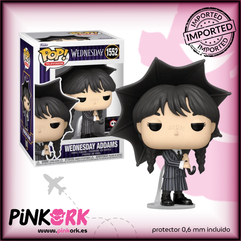El Funko Pop! N.º 1552 de Wednesday Addams with Umbrella nos muestra a la icónica hija de la familia Addams en su versión más reciente, inspirada en la exitosa serie de Netflix Wednesday. Con su característico uniforme de la Academia Nunca Más y sosteniendo un paraguas negro, esta edición exclusiva de Chalice Collectibles captura la esencia sombría y elegante del personaje. Disponible en stock en www.pinkork.es