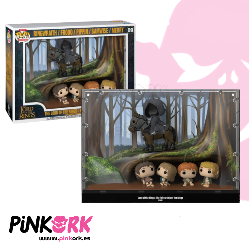 El Funko Pop! Moment Deluxe N.º 09 recrea una de las escenas más icónicas de The Lord of the Rings: The Fellowship of the Ring. La figura muestra al Nazgûl (Ringwraith) montado en su caballo, acechando en el bosque mientras Frodo, Sam, Pippin y Merry se esconden bajo las raíces de un árbol. Una recreación épica con gran nivel de detalle que captura a la perfección la tensión de este momento inolvidable. Disponible en stock en www.pinkork.es.