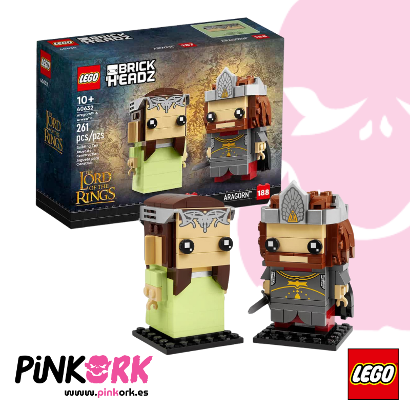 Revive la magia de El Señor de los Anillos con el set LEGO BrickHeadz 40632 que incluye a Aragorn y Arwen. Con 261 piezas, este set permite construir a los personajes con el inconfundible estilo BrickHeadz, destacando sus trajes icónicos: la armadura real de Aragorn y el elegante vestido élfico de Arwen. Ideal para fans de la saga y coleccionistas de LEGO. Disponible en stock en www.pinkork.es.