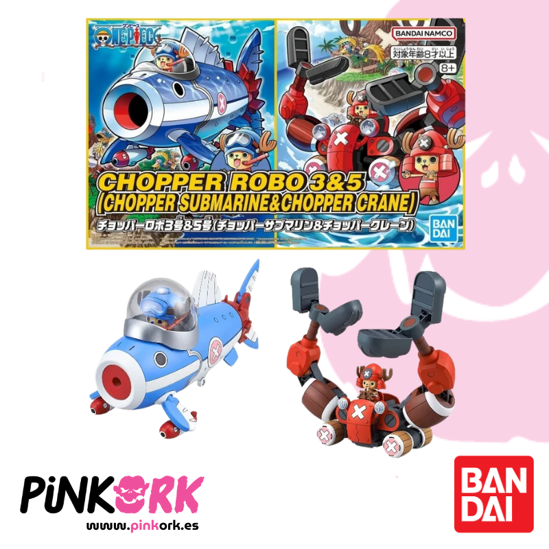 ¡Prepárate para construir y combinar! Este model kit oficial de Bandai incluye dos maquetas en un solo set: el Chopper Submarine (Robot 3) y el Chopper Crane (Robot 5), ambos protagonizados por Tony Tony Chopper de One Piece. Cada robot puede ensamblarse por separado, o fusionarse entre sí para formar una unidad combinada. Las piezas vienen precoloreadas y no requieren pegamento ni pintura. Disponible en stock con envío inmediato en www.pinkork.es.