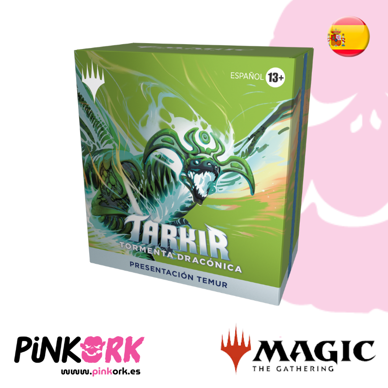 El Pack de Presentación (Prerelease Pack) de Temur de Tarkir Dragonstorm se centra en la fuerza salvaje y la conexión con la naturaleza. Cada caja incluye 5 sobres de juego de Tarkir Dragonstorm, 1 sobre especial de 14 cartas temáticas del clan Temur (con 1 carta rara o mítica foil tradicional), 1 carta rara o mítica foil con el año estampado, 1 caja guardamazo decorada y 1 dado Spindown. Producto en español, en stock con envío gratuito en www.pinkork.es.