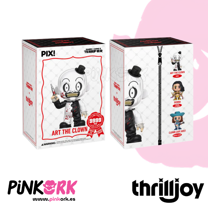 ¡Su sonrisa lo dice todo! Este aterrador Thrilljoy PIX! presenta a Art the Clown, el siniestro payaso del universo Terrifier, cubierto de sangre, con su clásico traje blanco y negro, maquillaje espeluznante, su sombrerito de copa y una enorme sonrisa que hiela la sangre. En una mano lleva una jeringa llena de sangre, dispuesto a causar estragos en cualquier colección que se cruce en su camino. Una figura ideal para los amantes del horror más extremo y perturbador.