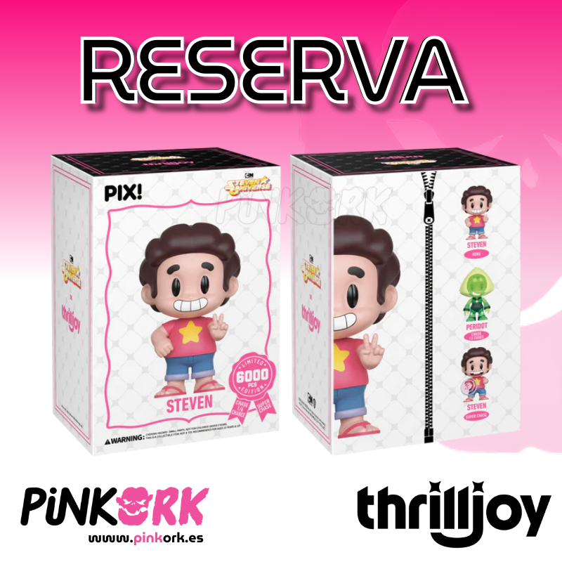 “¡Siempre salvaremos el día!” Este Thrilljoy PIX! presenta a Steven, el carismático protagonista de Steven Universe, con su inseparable camiseta rosa con estrella amarilla, pantalones cortos vaqueros y chanclas rosas. Con el pelo rizado, una gran sonrisa y la señal de la paz en alto, Steven llega para llenar tu colección de energía positiva, humor y magia de las Crystal Gems.